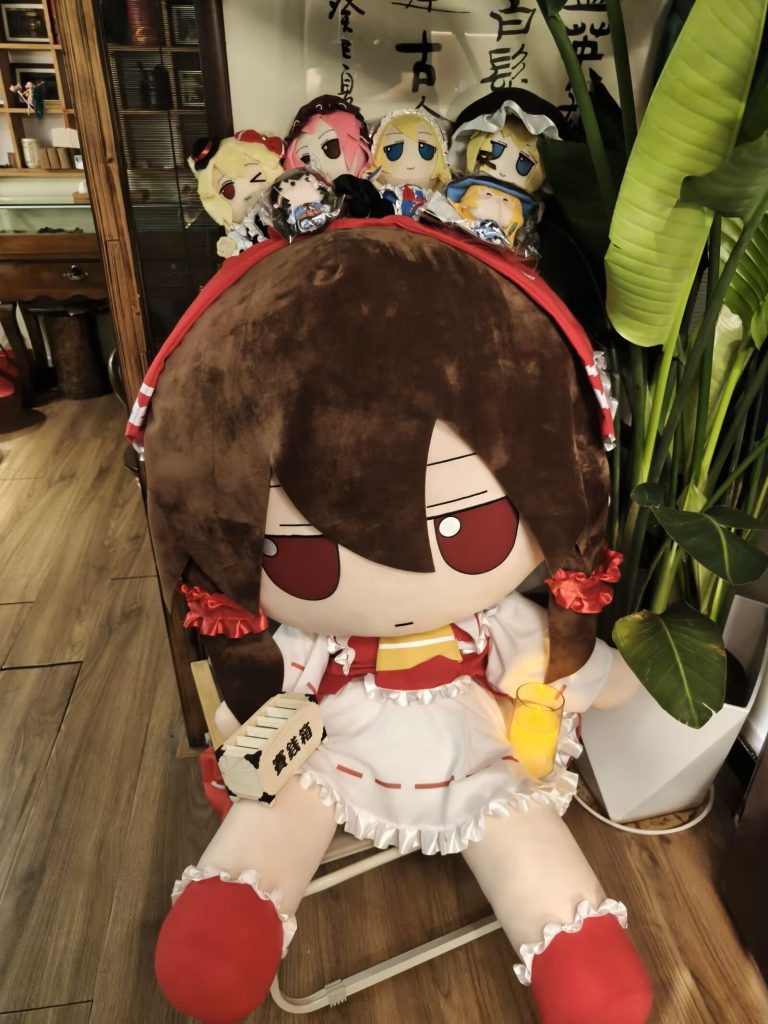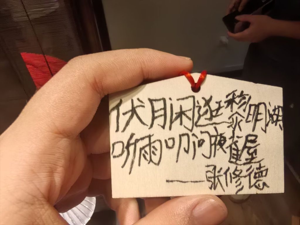 (图2、3)老板跟我说他差一点都要睡着了,那天下午来了一个人,晚上目前也就我一个,但是在聊天过程中又来了两个人,我们在欢声笑语之中结束了这一天。而在走之前,我和几位同伴在墙上挂上了各自的墨宝(图4、5 我留下“伏月闲逛黎明湖,听雨叩问夜雀屋”图6则是店里的大灵梦)。